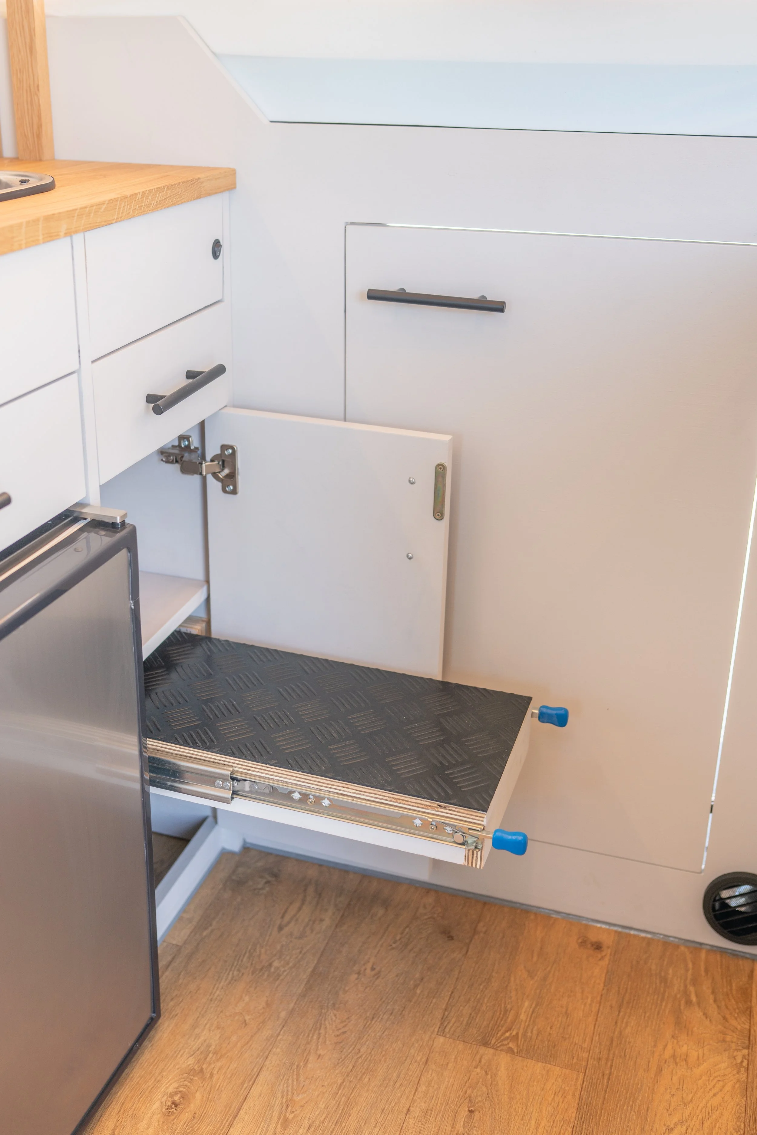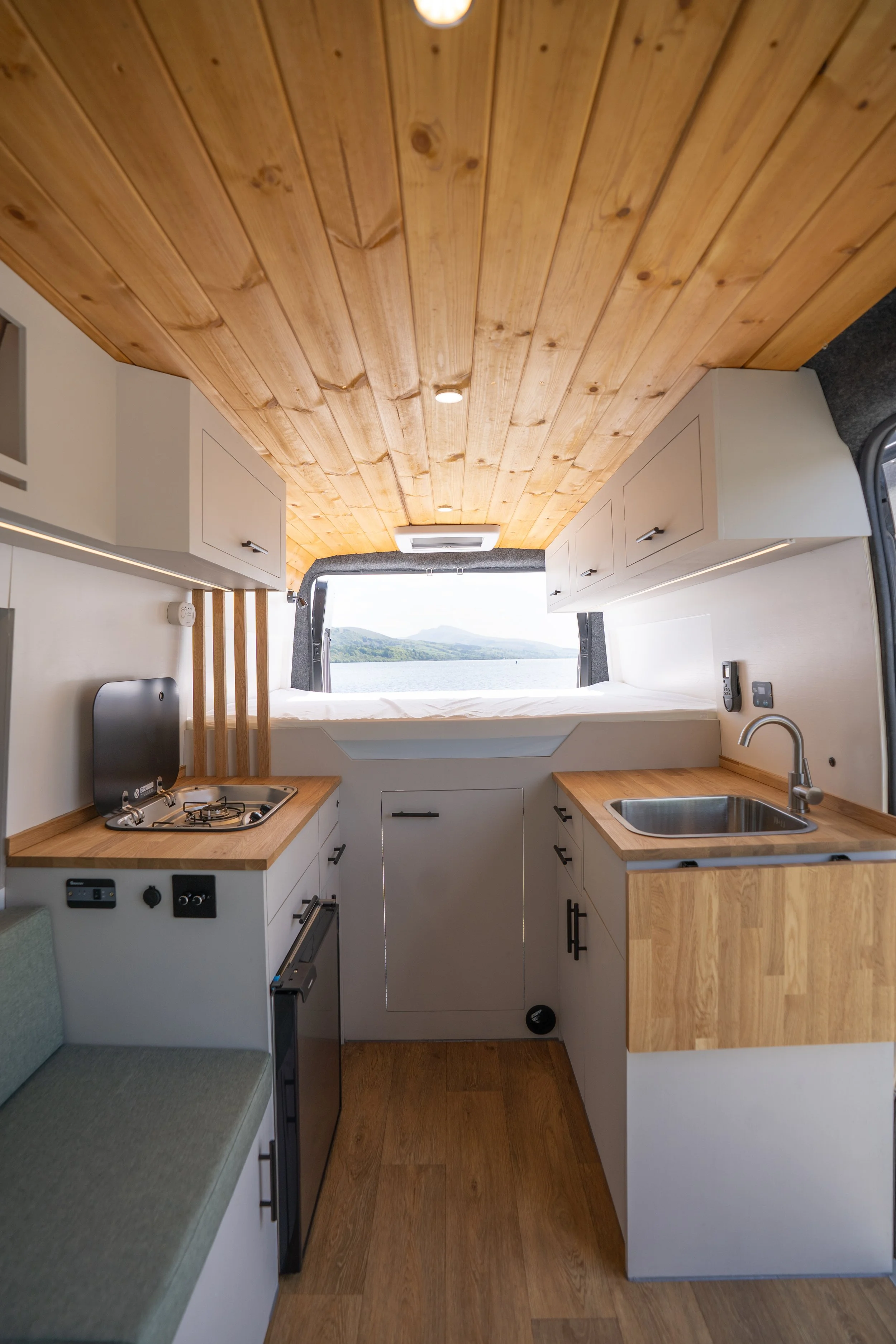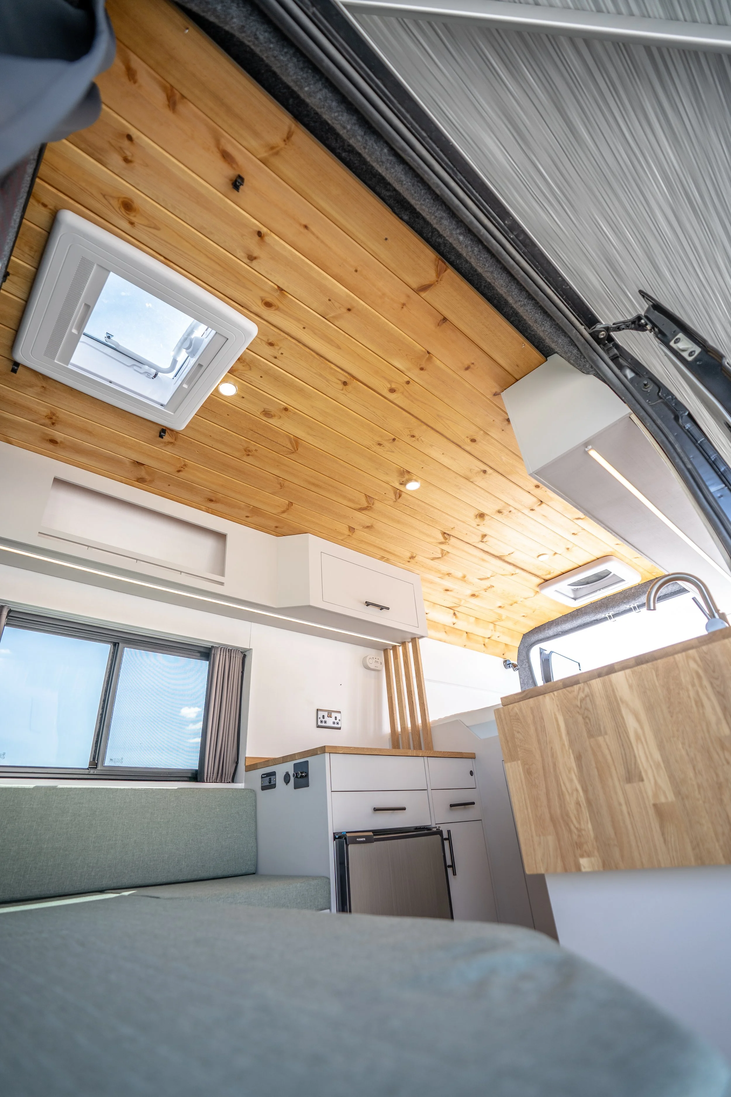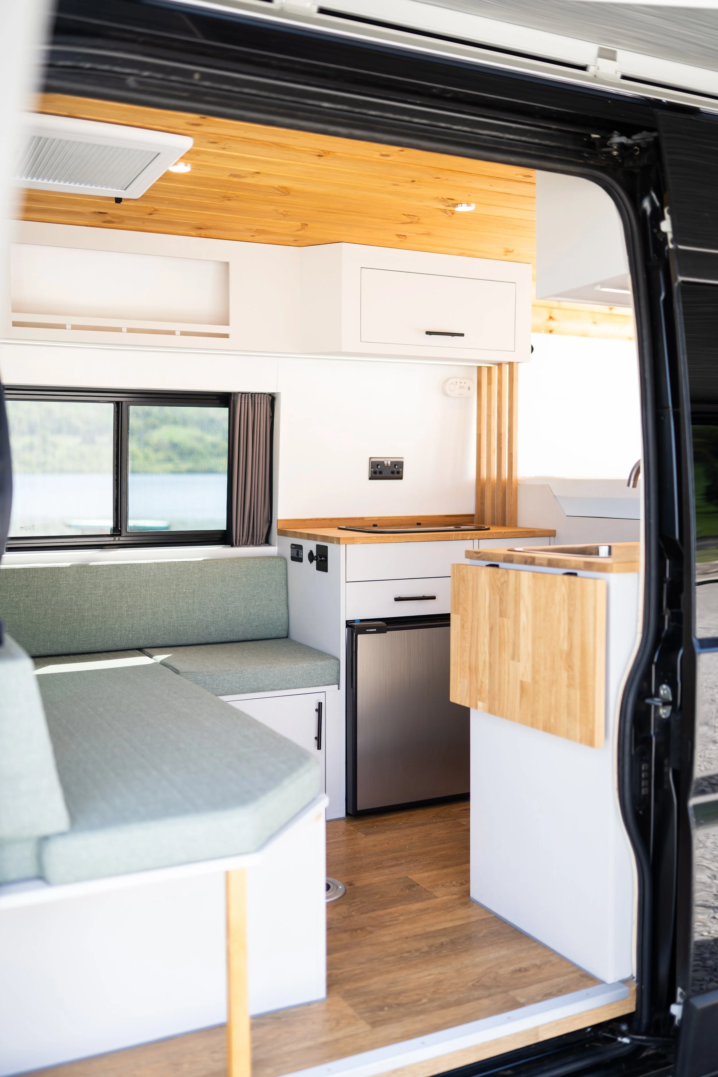 We know storage is important and with a large boot/garage area, 1m wide and 1.5m in length this can help store bikes and traveling equipment. In the living area there is more space above the cab and underneath the sofa as well as the cabinets to help create a clutter free space. All this helps create a spacious and airy feel to the campervan giving a more relaxed environment.