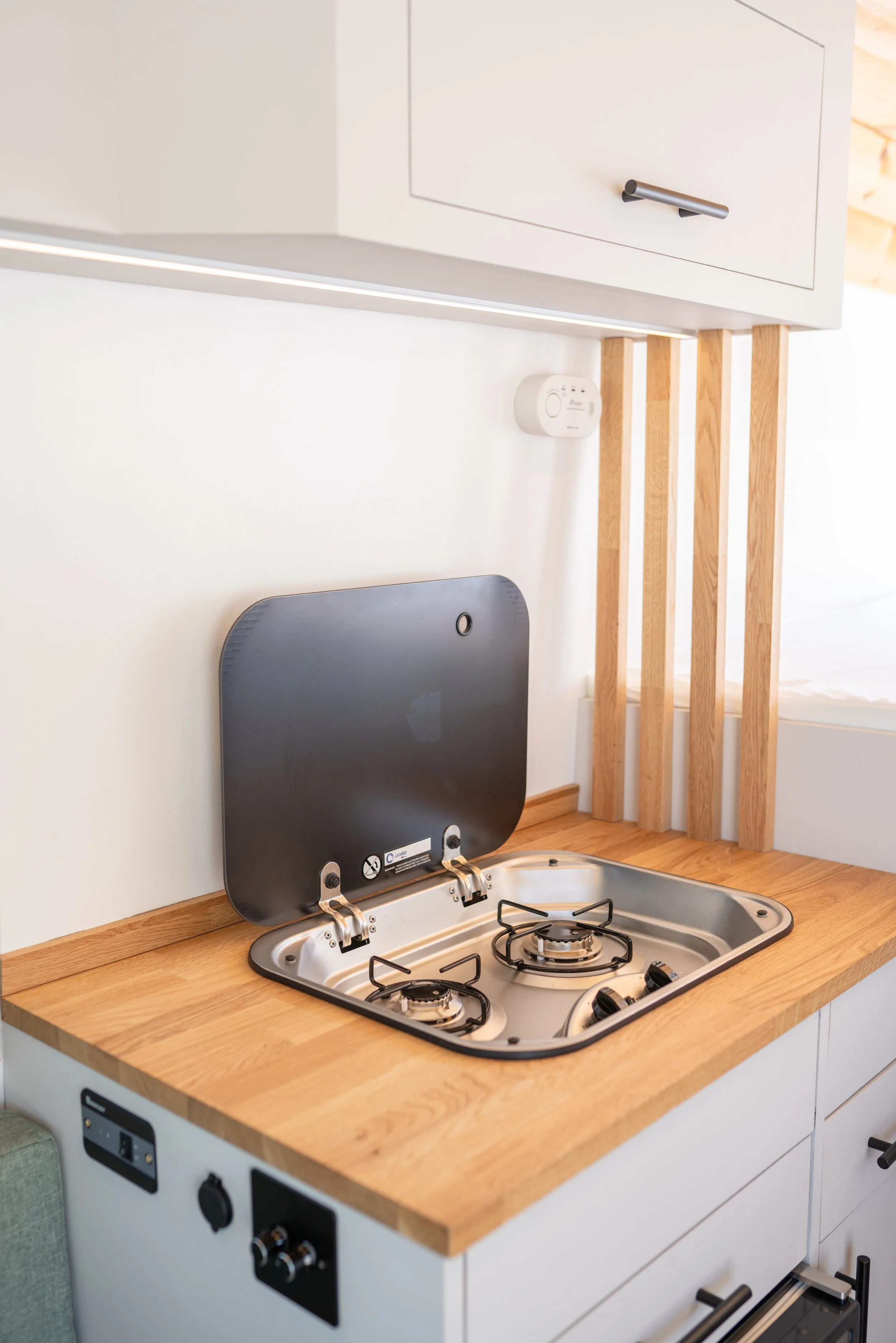 Gas is only used for the 2 burner hob, provided by a Campingaz bottle which is widely used throughout the UK and Europe and located at the rear of the campervan for ease of access when replacing.
