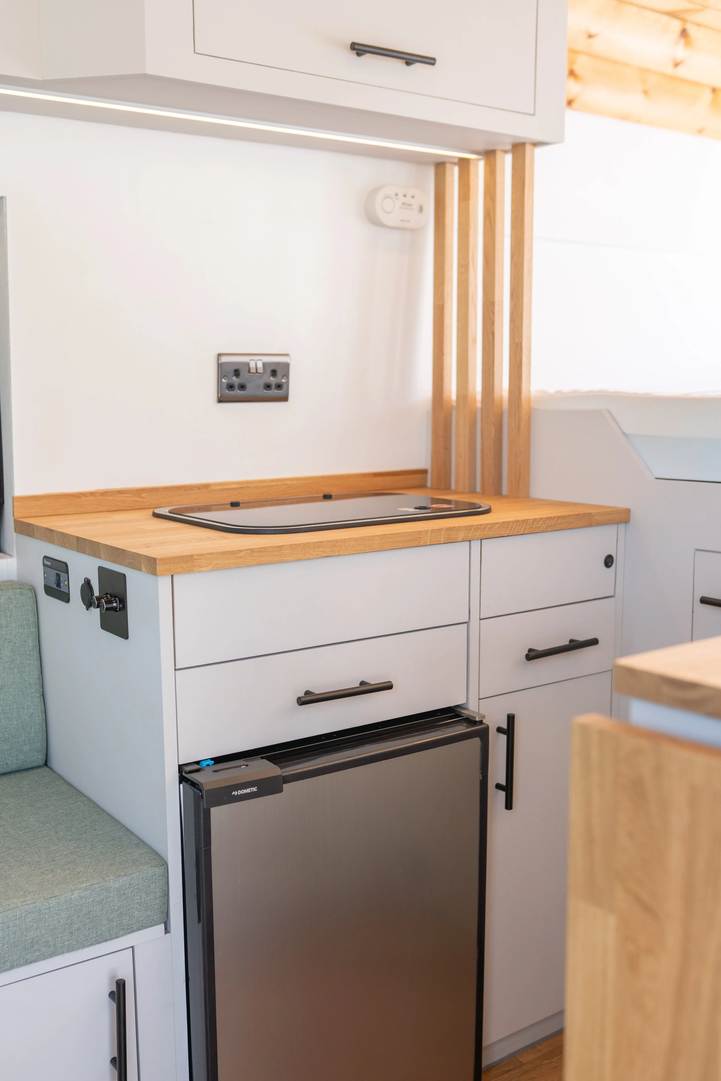 We believe having a large fixed bed and ample lounging area helps recharge the batteries whilst on your travels, whilst not compromising on the kitchen area which has 1.9m of worktop space thanks to a worktop extension and flush fitting hob and sink and a 80l fridge/freezer.