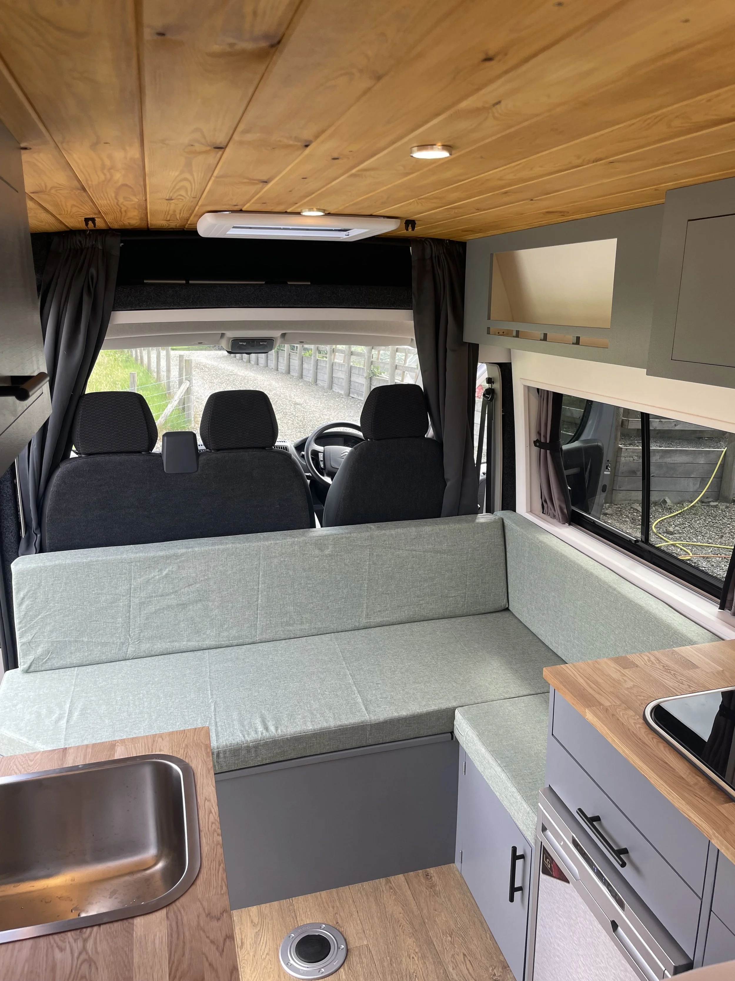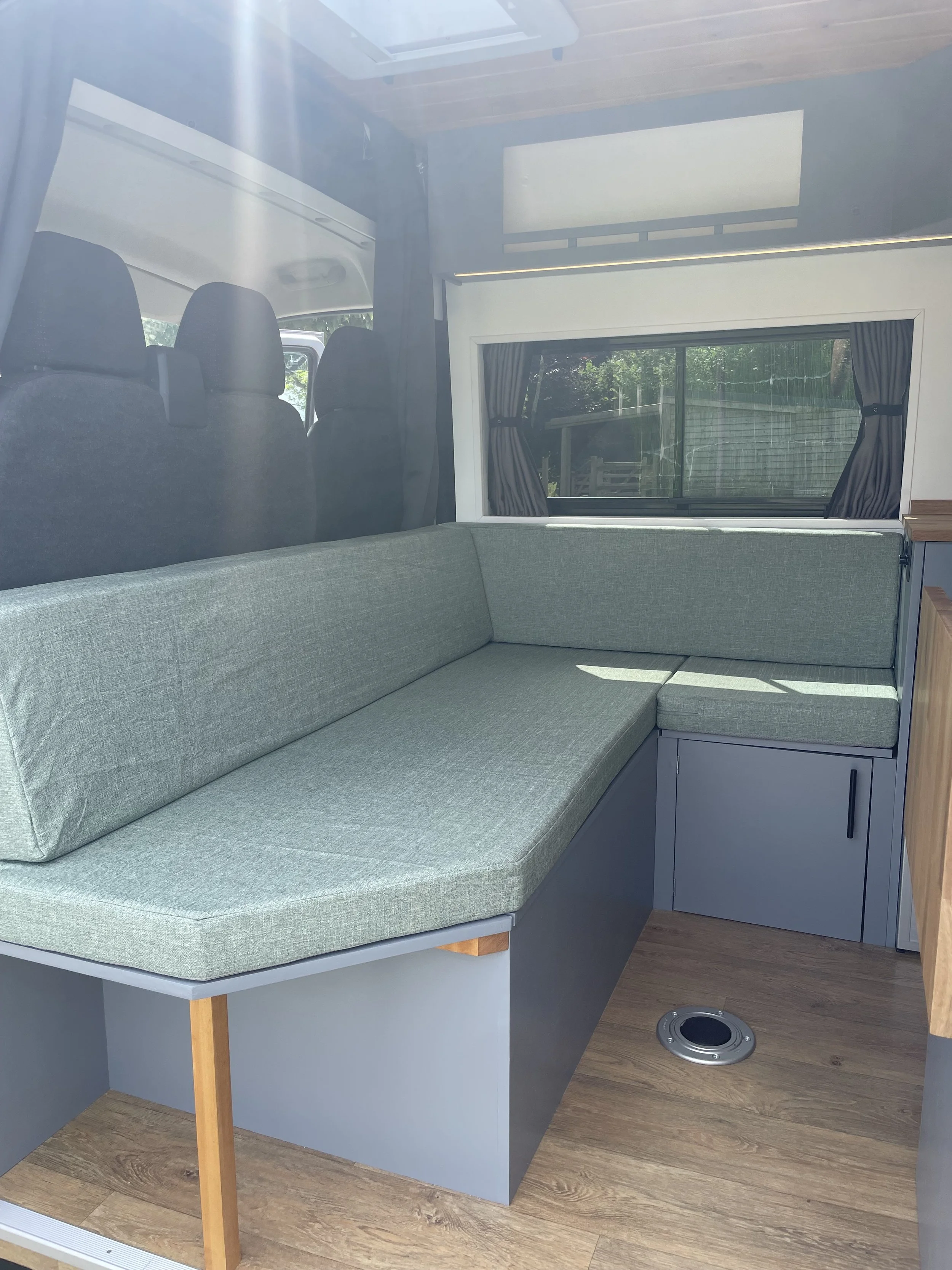 We know storage is important and with a large boot/garage area, 1m wide and 1.5m in length this can help store bikes and traveling equipment. In the living area there is more space above the cab and underneath the sofa as well as the cabinets to help create a clutter free space. All this helps create a spacious and airy feel to the campervan giving a more relaxed environment.