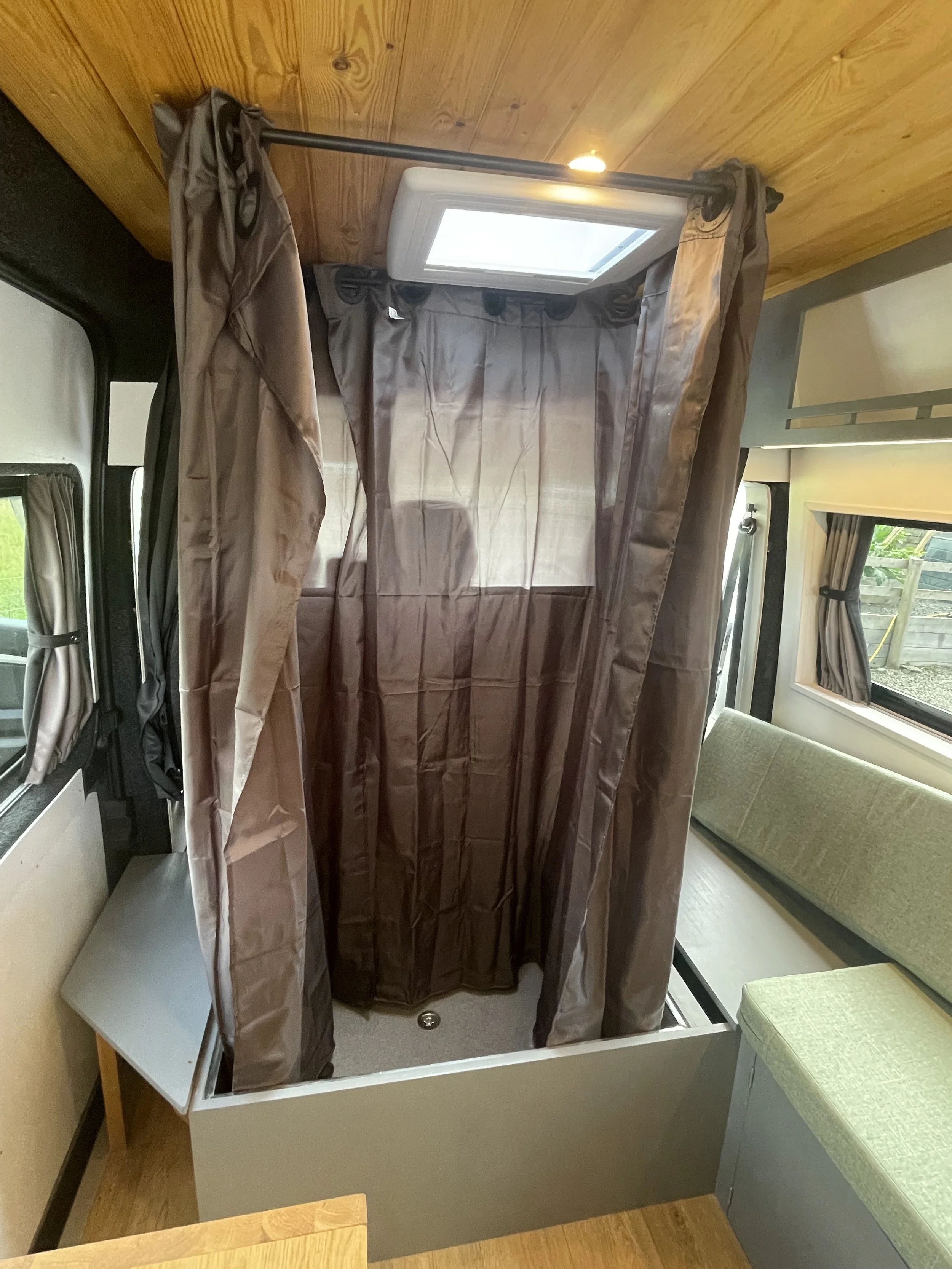 A portable toilet is found underneath the sofa also with the sofa lid and door opening to give access for ease of convenience as well as the pop up shower perfectly placed under the extractor fan to freshen up after a long day.